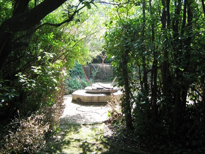 Un preciso disegno architettonico di vialetti parte subito dopo l’ingresso e porta ad una ‘piazzetta” pavimentata con al centro il basso pozzo ottagonale sormontato da una sorta di tonda ciambella che invita a sedersi.
