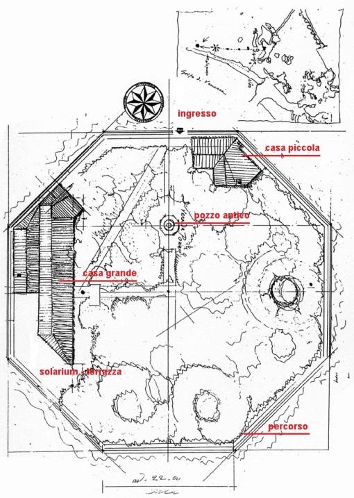 A settentrione si apre l’unica porta di accesso. A sinistra entrando vi è una prima casetta di circa 55 mq.