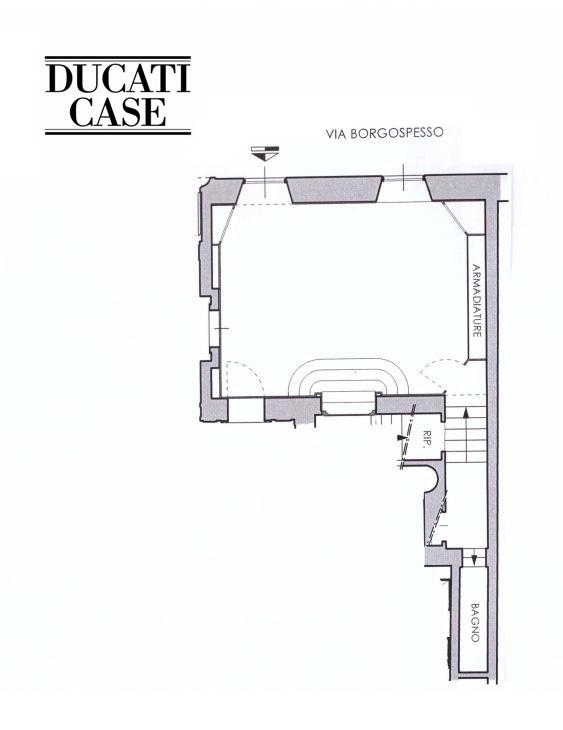 Esposizione doppia, doppio ingresso da strada e dal cortile, luminoso e affacciato su via Borgospesso con due vetrine, pavimento in seminato veneziano, boiserie antiche e grande lampadario, predisposizione aria condizionata, ben servito sia dai mezzi di superficie che dalla metropolitana linea rossa fermata MM San Babila o linea gialla fermata MM Montenapoleone, in elegante stabile d'epoca del 700.
